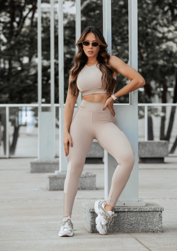 Conjunto Fitness Dune: alta compressão, zero transparência e proteção UV50+ para treinos seguros e cheios de estilo. Top sustentável com excelente conforto, firmeza e design moderno, unindo performance, elegância e confiança em cada movimento.