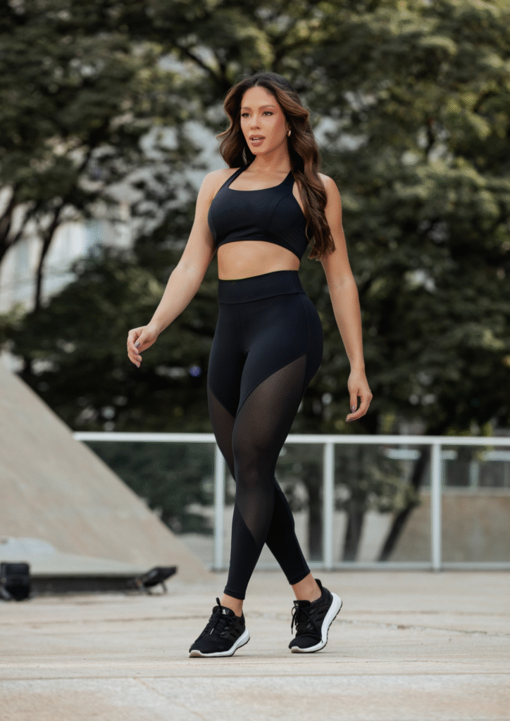 Conjunto Fitness Nexus: alta compressão, zero transparência e proteção UV50+ para treinos seguros e estilosos. Top sustentável com excelente conforto, firmeza e design moderno, unindo performance, elegância e consciência em cada detalhe.