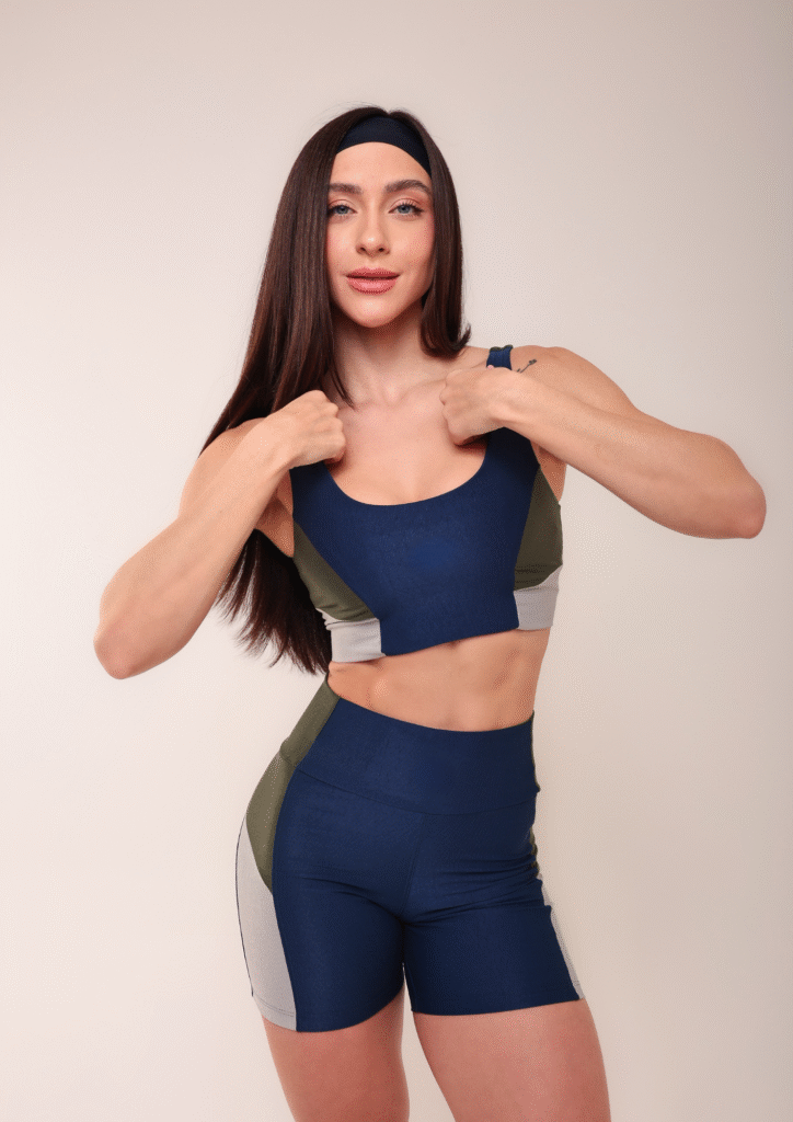 Conjunto de Short Fitness Rise: alta compressão, zero transparência e proteção UV50+ para treinos com conforto e segurança. Top sustentável, moderno e estiloso, garante firmeza, elegância e performance em cada movimento.