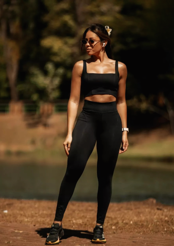 Conjunto Fitness Soft Movie: alta compressão, zero transparência e proteção UV50+ para treinos com segurança e estilo. Top sustentável, confortável e firme, com design moderno que une performance, elegância e confiança em cada movimento.